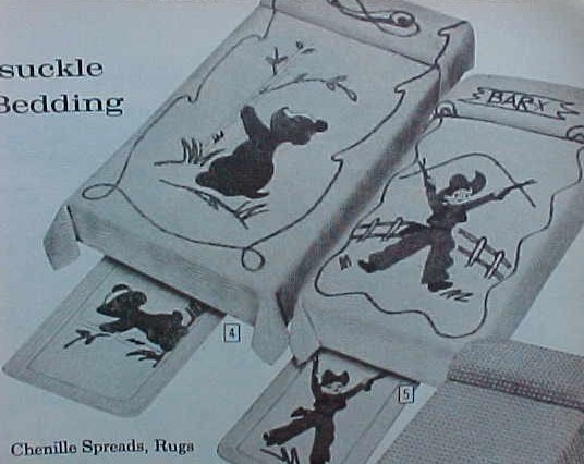 Youth Bedding, our best spreads. Cotton pinpoint chenille. Multicolor motif on white. 52 x 80 inches. Cowboy or bear motif $3.87 each. Matching rugs 21 x 36 inches $2.87 each. |