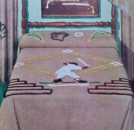 z"Little Slugger" in high pile cotton chenille. Background of tan waveline. Rug is skid-resistant and measures 28 inches in diameter. Bunk spread 63 x 90 inches $5.37; Twin size $5.74; Full $6.77. Rug $2.84 Drapes (36 x 90) $5.74 pair.7 |