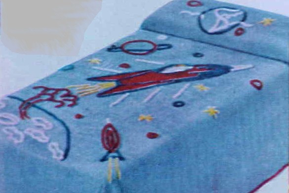 "Outer Space" adventure into the unknown. Zooming rocket surrounded by plane and stars on blue background. Bunk size 63 x 90 inches $5.37; Twin $5.74; Full $6.77. Matching drapes $5.74 pair. |