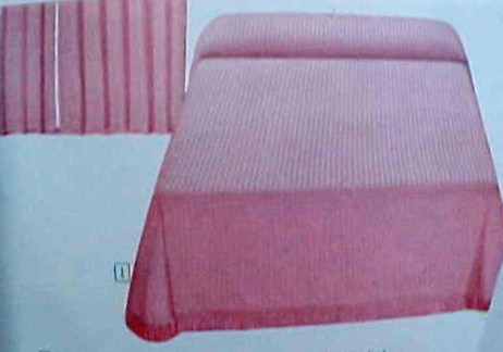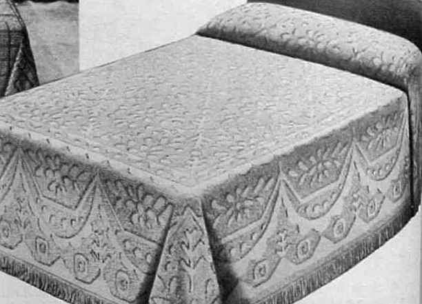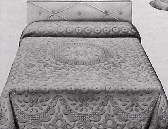 Hobnail Chenille woven of firmly tufted Viscose rayon on cotton backing. Over 19,600 tufts, virtually lint-free. Colors: sunshine yellow, frosty pink, medium capri blue, spring green or white. Super full size $6.84 or regular full size $5.94. Twin $5.94. Matching drapes 36 x 90 inches $5.94 pair. |