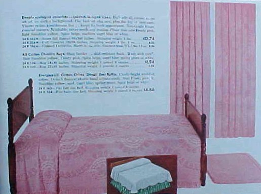 Deeply scalloped spreads and coverlets high pile rayon on cotton background. Colors: frosty pink, sunshine yellow, spice beige, medium capri blue or white. Coverlet (78 x 98 inches) $8.95 each. Full spread $10.74 each. Draperies (36 x 90 inches) $8.94 pair. All cotton chenille rugs size 24 x 36 inches $1.94 or size 27 x 48 inches $2.94 each. |