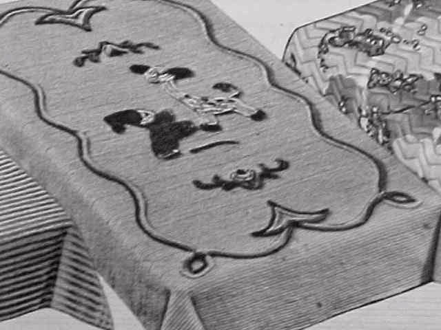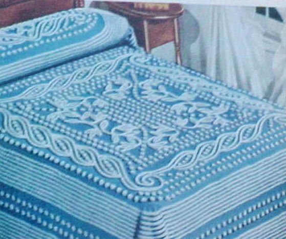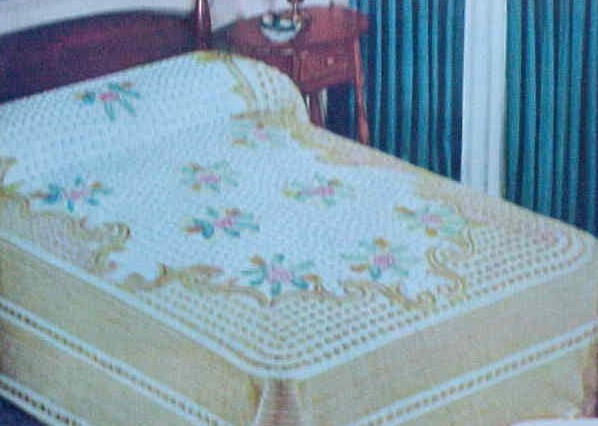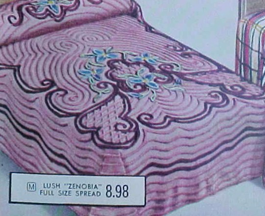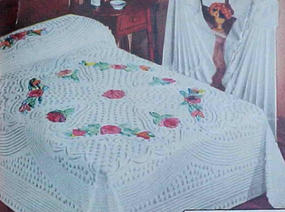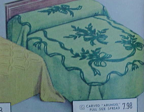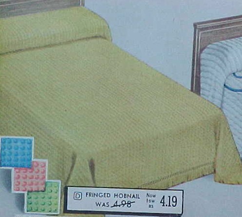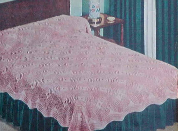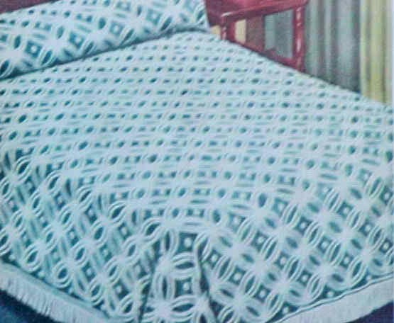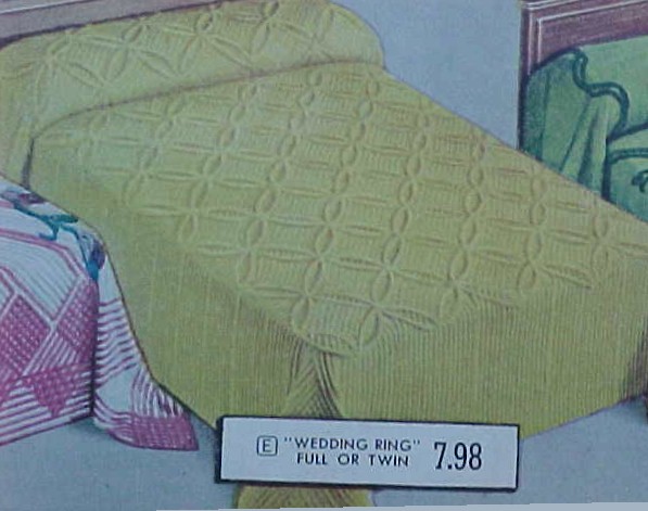 "Wedding Ring" Rich classic style. Intricately entwined rings overlaid on a close-tufted waffle patterned background. American beauty red, sunny yellow, dusty rose, emerald green or white. Full or twin $7.98 each |