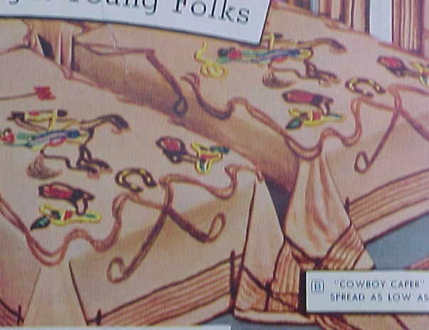 "Cowboy Caper" features brilliant cattle brands and cowboy designs. Suntan or silver-gray. Bunk size $4.98 or twin $5.98 or full $6.98. Matching rug 24 x 40 inches $3.79 each. Matching drapes 36 x 82 inches $4.98 pair. |