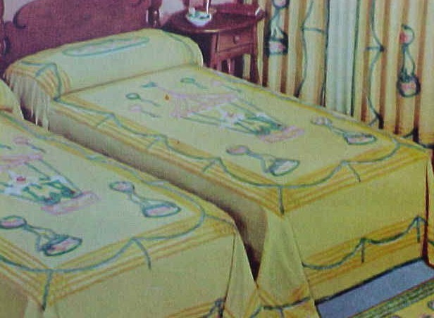 "Festival" Rich colonial styling, beautifully bordered. Pastel colors: sunny yellow, rose or blue ... all on white background. Full or twin size $12.98 each. |