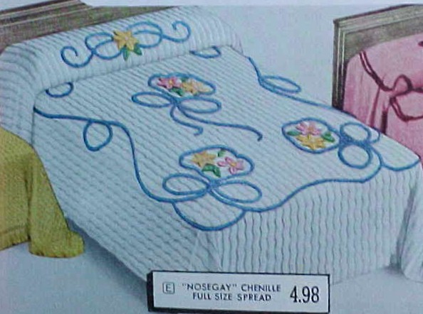 "Nosegay" fluffy cordurette chenille, wavy rows. Dainty florals on close-cut wavy chenille. Background colors: white, medium blue or rose. Full $4.98 each |