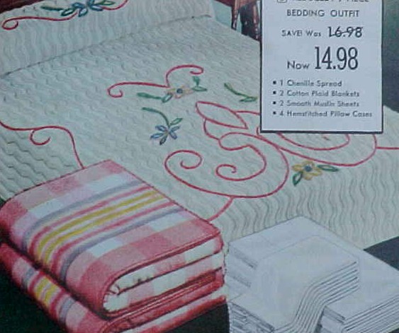 Bedding outfit, 1 "Wavelon" chenille spread, 2 cotton plaid blankets, 2 muslin sheets, 4 pillow cases. $14.98 |