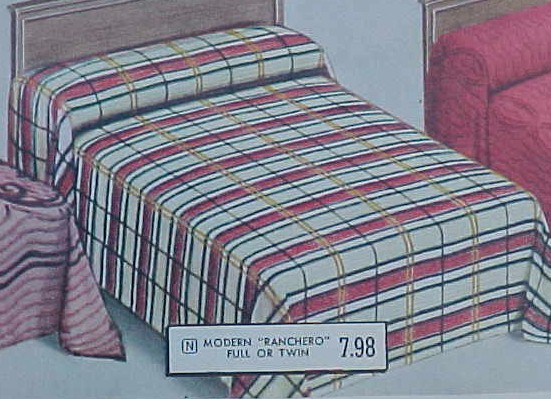 "Ranchero" Modern new cordurette plaid. Perfect for modern ranch style homes. Soft-textured chenille. Red or bright green plaid. Full or twin size $7.98 each. |